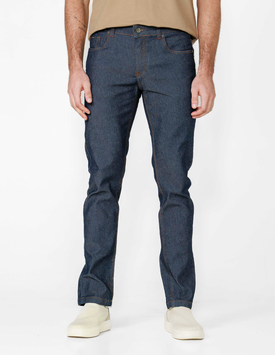 Calça jeans, em tecido encorpado e moderno. Fechamento frontal em zíper e botão de metal personalizado.