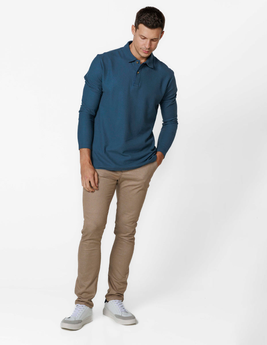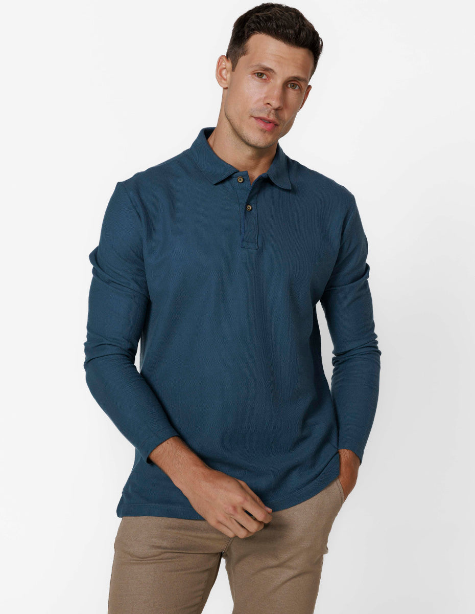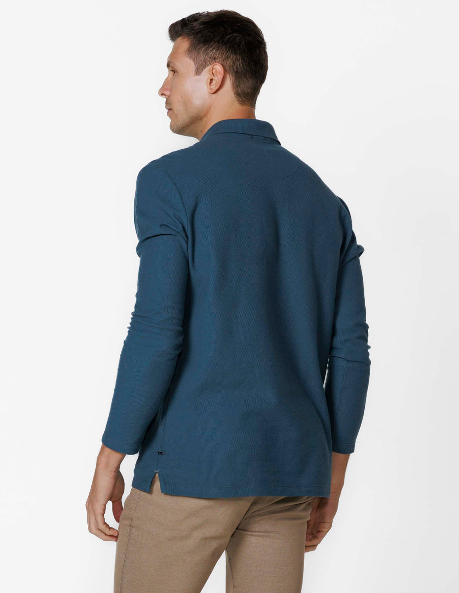 Polo em piquet manga longa, apresenta no lado externo desenhos com várias formas em alto-relevo, sendo o mais comum o formato de colmeia. Nesse modelo os favos ficam bem definido